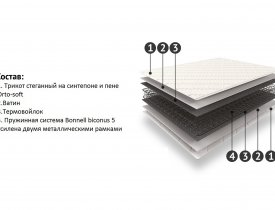 Состав: Бонель 14 см, спонбонд, эргоформ 1 см, ткань жаккард стеганный на 100гр сентипона, усиление по углам матраса.